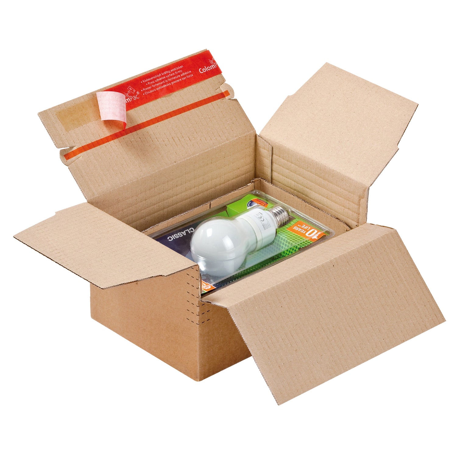 Karton mit variabler Tiefe und selbstklebendem Verschluss für den Versand